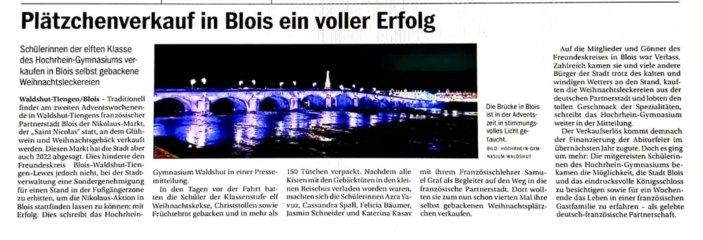 Samedi 3 décembre, 5 jeunes lycéennes de Waldshut encadrées par leur professeur de français Samuel Graf ont vendu Christollen, Weinachtsplätzschen et Linzertorte et vin chaud place de la Résistance à Blois. Nous les avons aidés pour la loghistique et des membres de notre association étaient présents sur le stand.